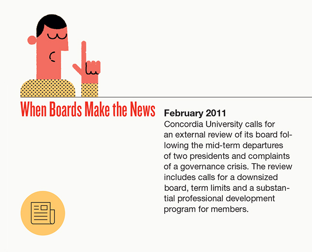 Some boards have contracted significantly in response to criticism that they are well beyond governance norms of 12 to 15 members, leading to inefficiency and a risk of creating a board within a board. Concordia, for one, reduced the size of its board from 42 to 27 members following its governance review.