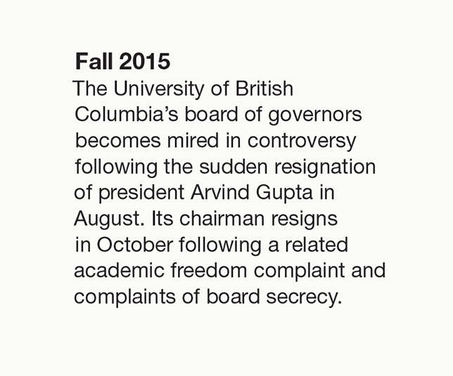 “When you have 800 faculty members saying they’ve lost confidence in the board of governors, that’s really significant,” Mark MacLean, then president of the University of British Columbia Faculty Association, told the Globe and Mail after a no-confidence faculty vote in March 2016. The vote was taken following the resignation of UBC president Arvind Gupta, allegations of secretive backroom dealings and censorship, and the resignation of the board’s chair.