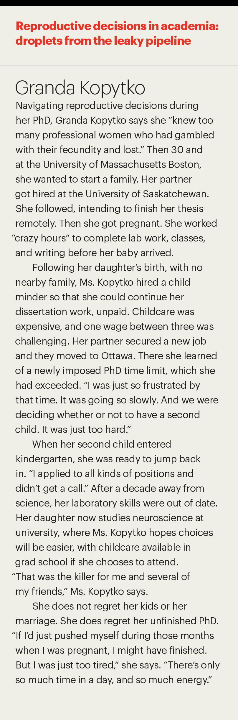 “If there are resources out there to help one navigate back into academia post-breeding, I am not aware of them,” says UBC’s Dr. Martin. She attributes her successful return to academia to sheer determination and working, mostly unpaid, while birthing and caring for two babies. Other sources contacted for this article – the Canadian Coalition of Women in Engineering, Science, Trades and Technology; NSERC’s Chairs for Women in Science and Engineering program; the Canadian Association of University Teachers; the writers of the Hook & Eye blog, among others – were unaware of any academic returner programs in Canada. Yet the disproportionately few Canadian women progressing to the senior academic ranks, and low birthrates among those that do, suggest that returner programs might help repair some of the leaks in the pipeline.