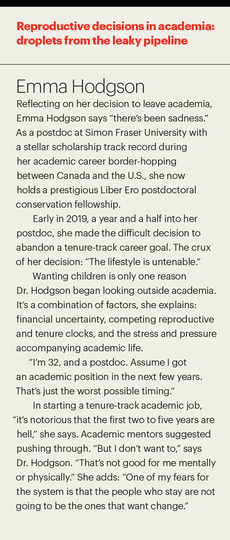 One made-in-Canada resource outside academia is the Work Re-Engagement Program of the Alberta Women’s Science Network. The program is designed to assist female STEM professionals in the province to return to work after an absence of two years or more. “If we’re losing women in STEM, it’s because they’re not finding their place,” notes geologist Alicia Bjarnason, who co-authored the guide explaining the program. She adds that returning after a career break may require a new direction, noting that, when it comes to career paths, “We’re on a jungle gym here, not a ladder.”